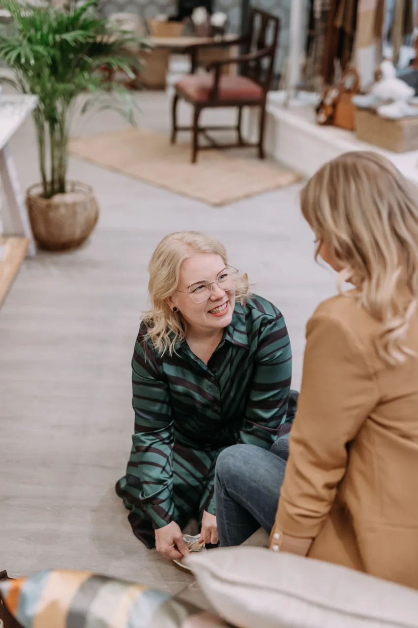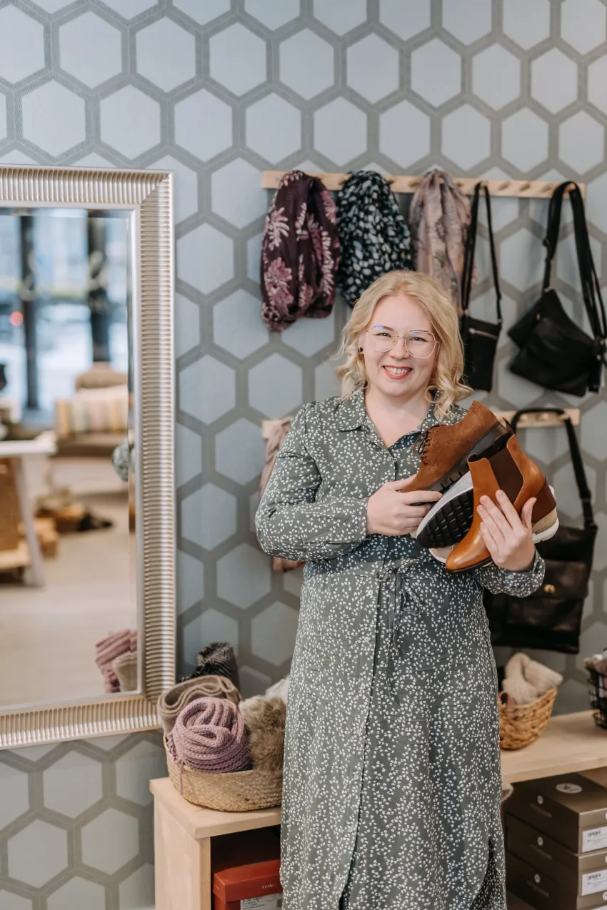 Tiia valitsee kengät asiakkailleen ulkonäön lisäksi laadun ja jalkaan istuvuuden mukaan, ammattitaitoaan hyödyntäen.